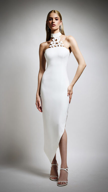 Abito midi Twins Fantasy colore bianco con taglio a punta sul davanti collarino con decorazioni a fiori con cristalli centrali