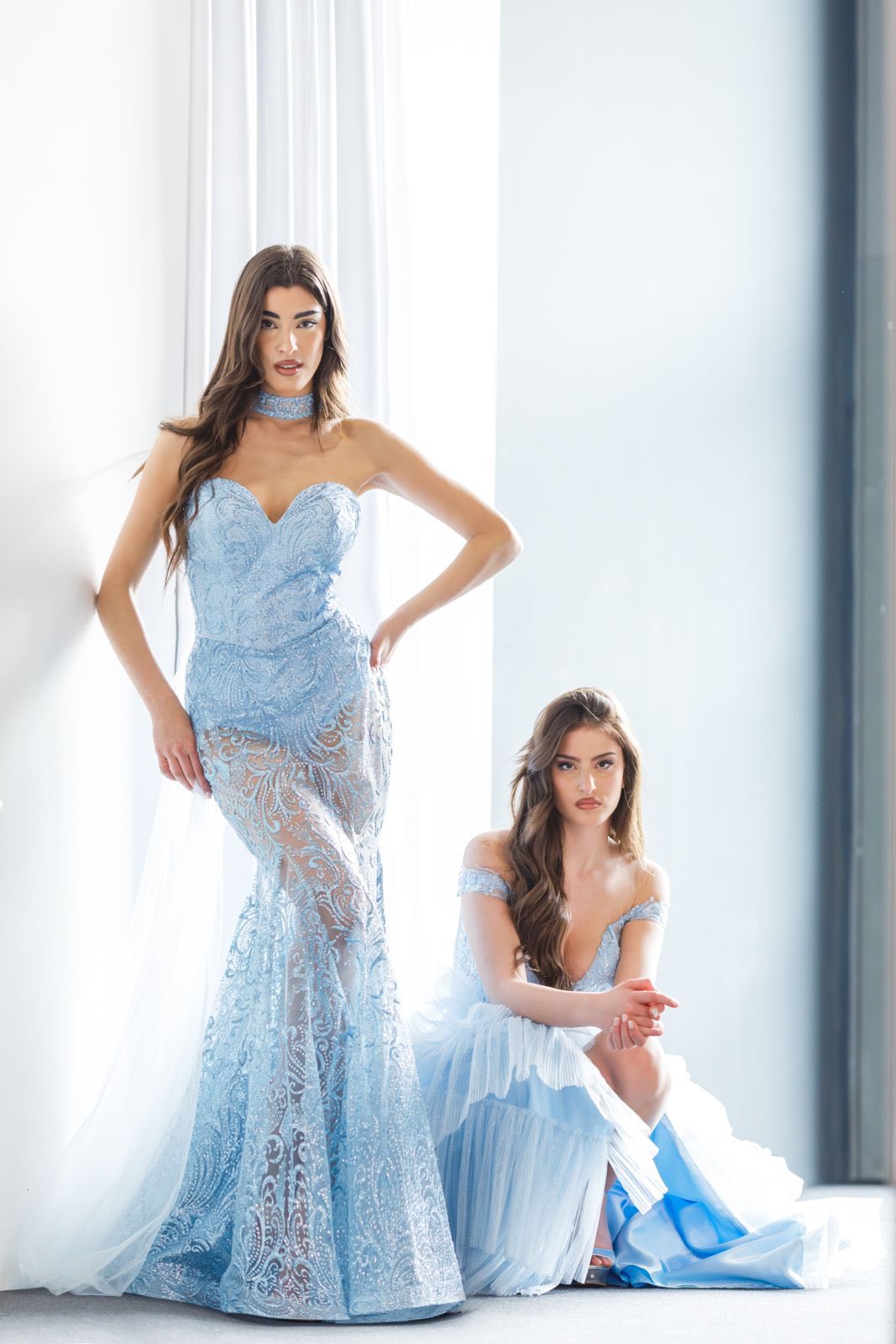 € 755,00Abito lungo azzurro blu chiaro Twins Fantasy con doppio spacco quadrato con applicazioni di borchie con parte trasparente al petto