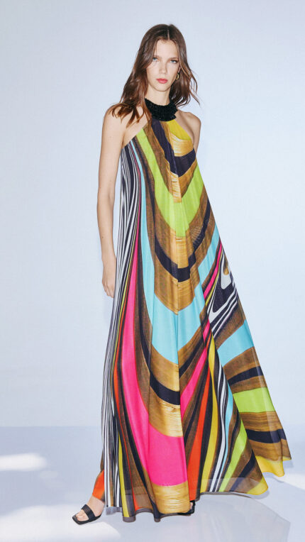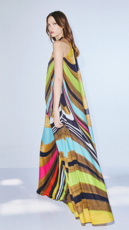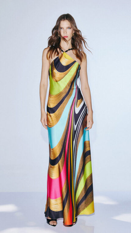 € 362,00Abito fantasia Twins Fantasy morbido che scende sfiancato con collo con cristalli effetto collana nero che scendono dal centro del petto a spalline schiena scoperta