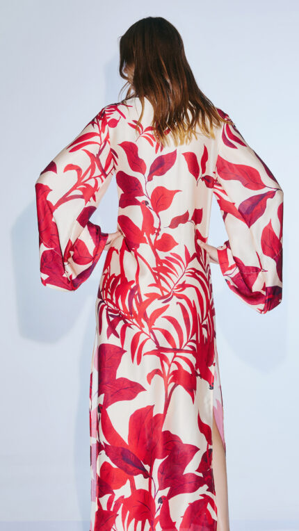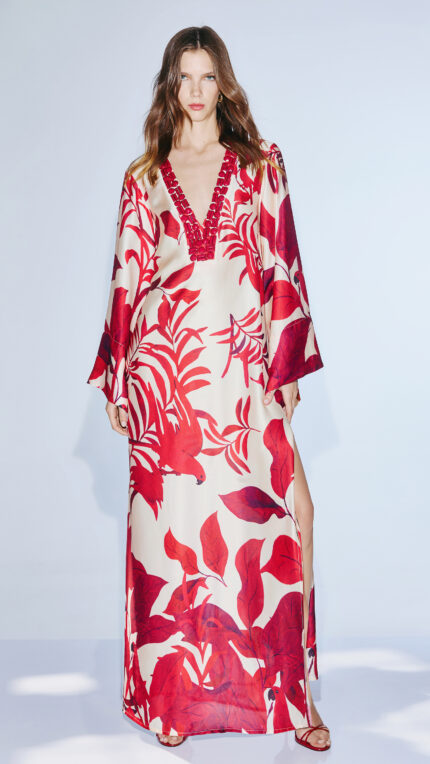 € 346,00Abito beige e rosso Twins Fantasy effetto caftano con maniche larghe a campana lungo e morbido con scollo a V profondo decorato con pietre rosse