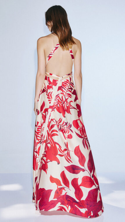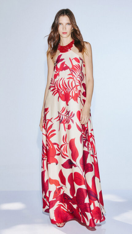 € 582,00Abito Twins Fantasy beige fantasia sul rosso morbido semi aderente con allaccio dietro la schiena a X schiena scoperta effetto collana al collo con cristalli