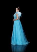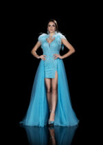 Abito corto avanti e lungo dietro 18 Celebrity Impero Couture azzurro con piume sulle spalle scollo a cuore paillettato e cristalli