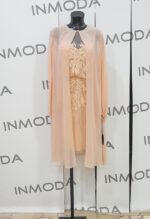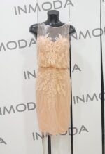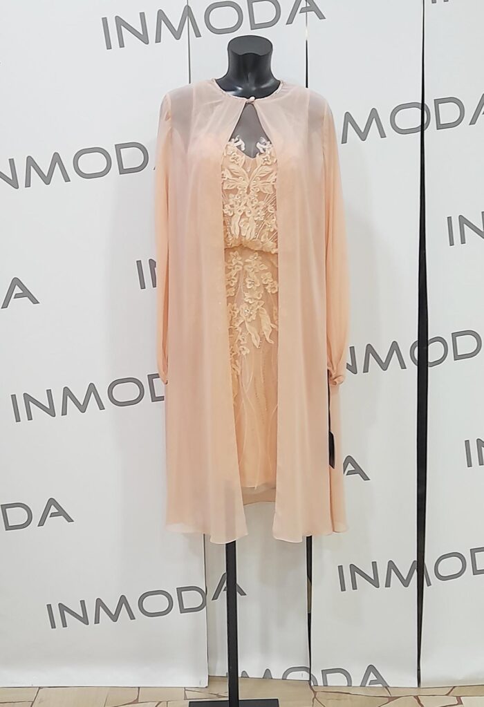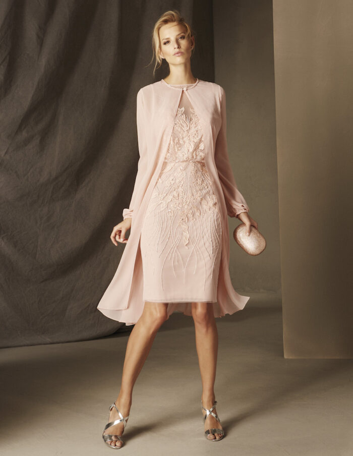 Abito corto con soprabito leggero pronovias con spalle trasparenti riporti in pizzo floreale