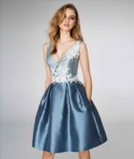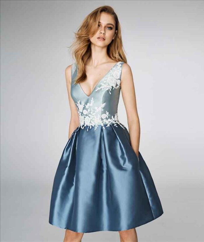 Abito corto st patrick in due tonalità di blu con riporto di pizzo bianco e gonna larga