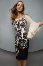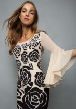 Abito tubino Allure evening beige e nero con fantasia a forma di rosa e manica trasparente a campana