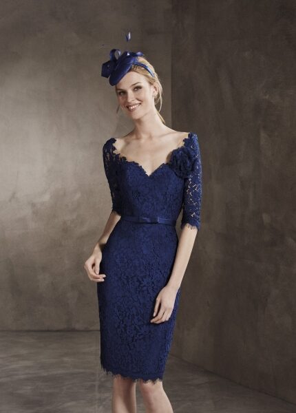 Tubino blu aderente navy st patrick interamente in pizzo con maniche a tre quarti schiena trasparente cinturino