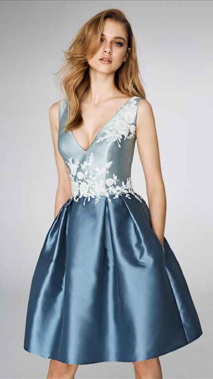 Abito corto st patrick in due tonalitร di blu con riporto di pizzo bianco e gonna larga