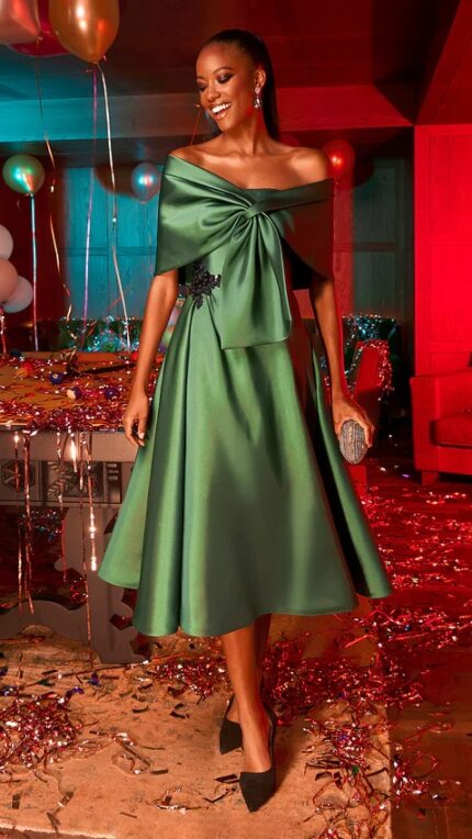 Abito pronovias senza spalline verde corto con stola lunga e decorazione color nero