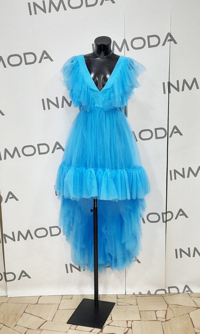 Abito twins fantasy in tulle corto avanti e lungo dietro giallo e azzurro con spalline larghe tulle