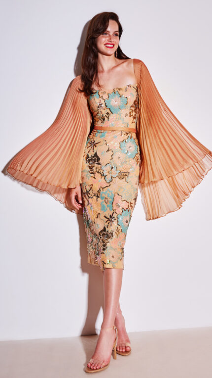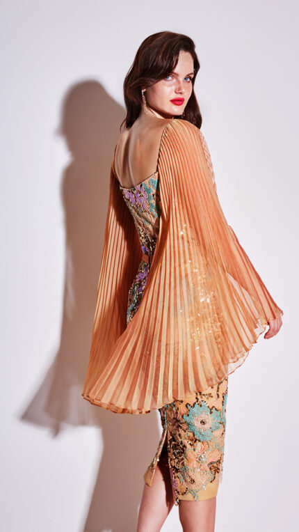 Abito corto Allure evening con maniche plissettate e decorato pizzo paillette