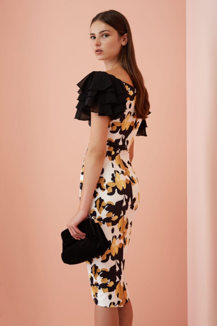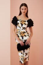 Tubino corto allure evening bianco con fiori sul giallo e nero con spalline nere applicate con elastico