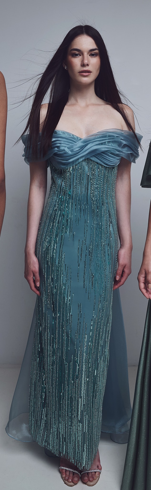 Abito Allure Evening colore verde pistacchio con bolerino compreso a fiocco sul retro abito a tubino decorato interamente di corallini