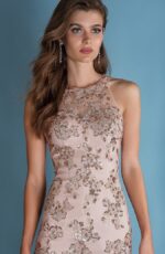 Abito allure evening in rosa chiaro con decorazioni in pizzo con paillette scollo trasparente abito corto