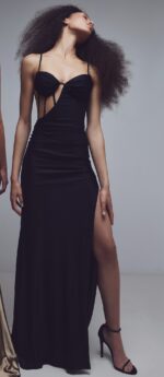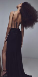 Abito Allure Evening nero con effetto trasparente con tessuto color carne sotto sul retro e sulla parte sinistra davanti e spacco sul davanti