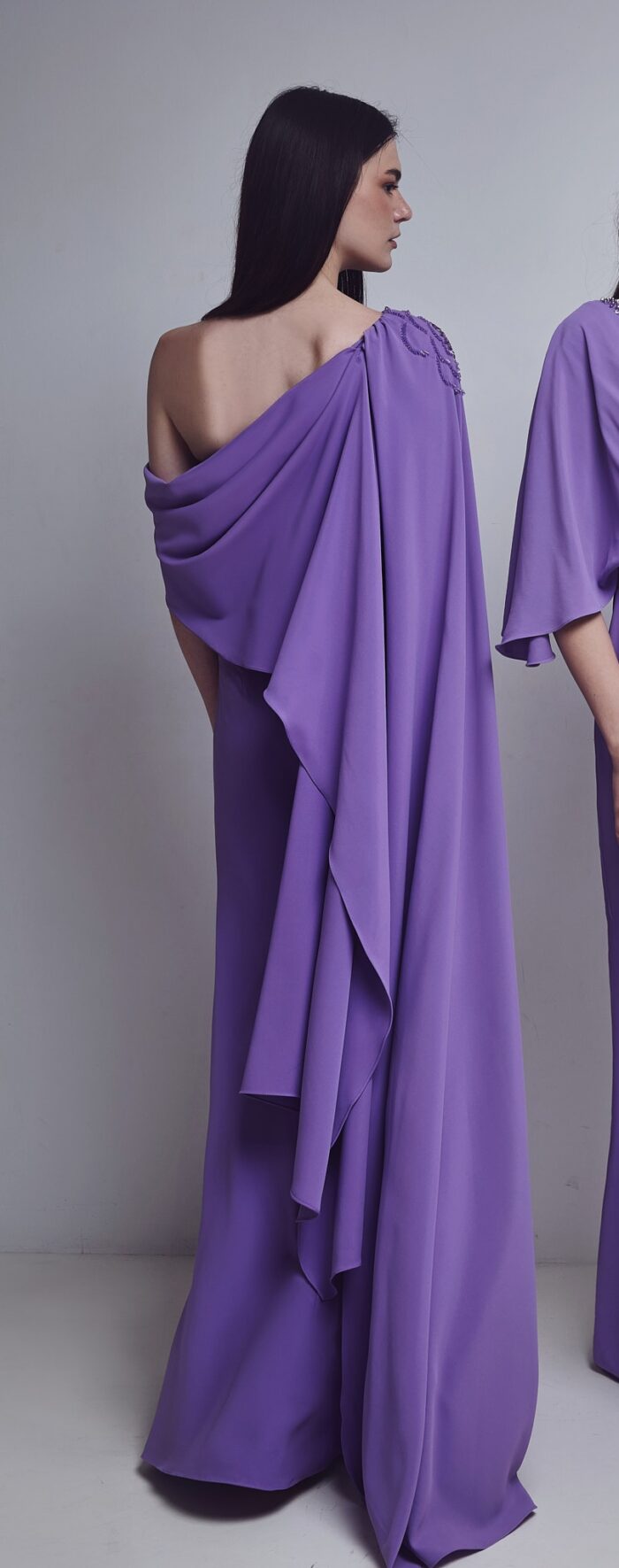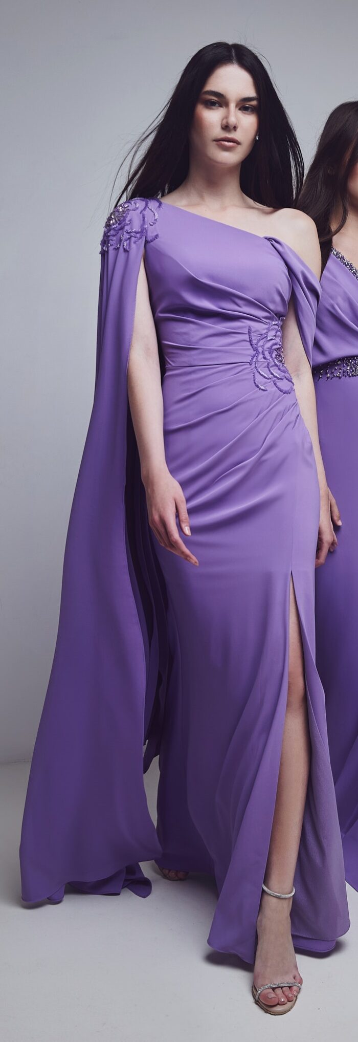 Abito Allure Evening viola con una spalla scoperta e manica mentre altra spalla con pannello lungo piedi decorazioni fiori aderente con spacco