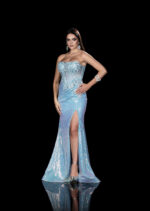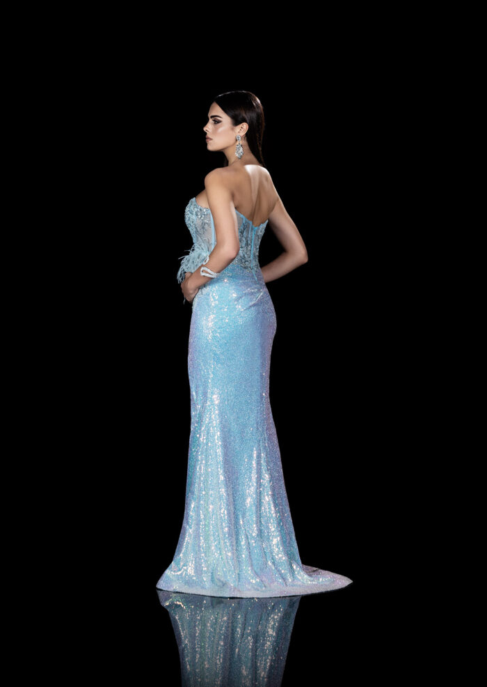 Abito azzurro celeste 18 Celebrity Impero a sirena con gonna interamente paillettata brillante corpetto steccato diagonale trasparente