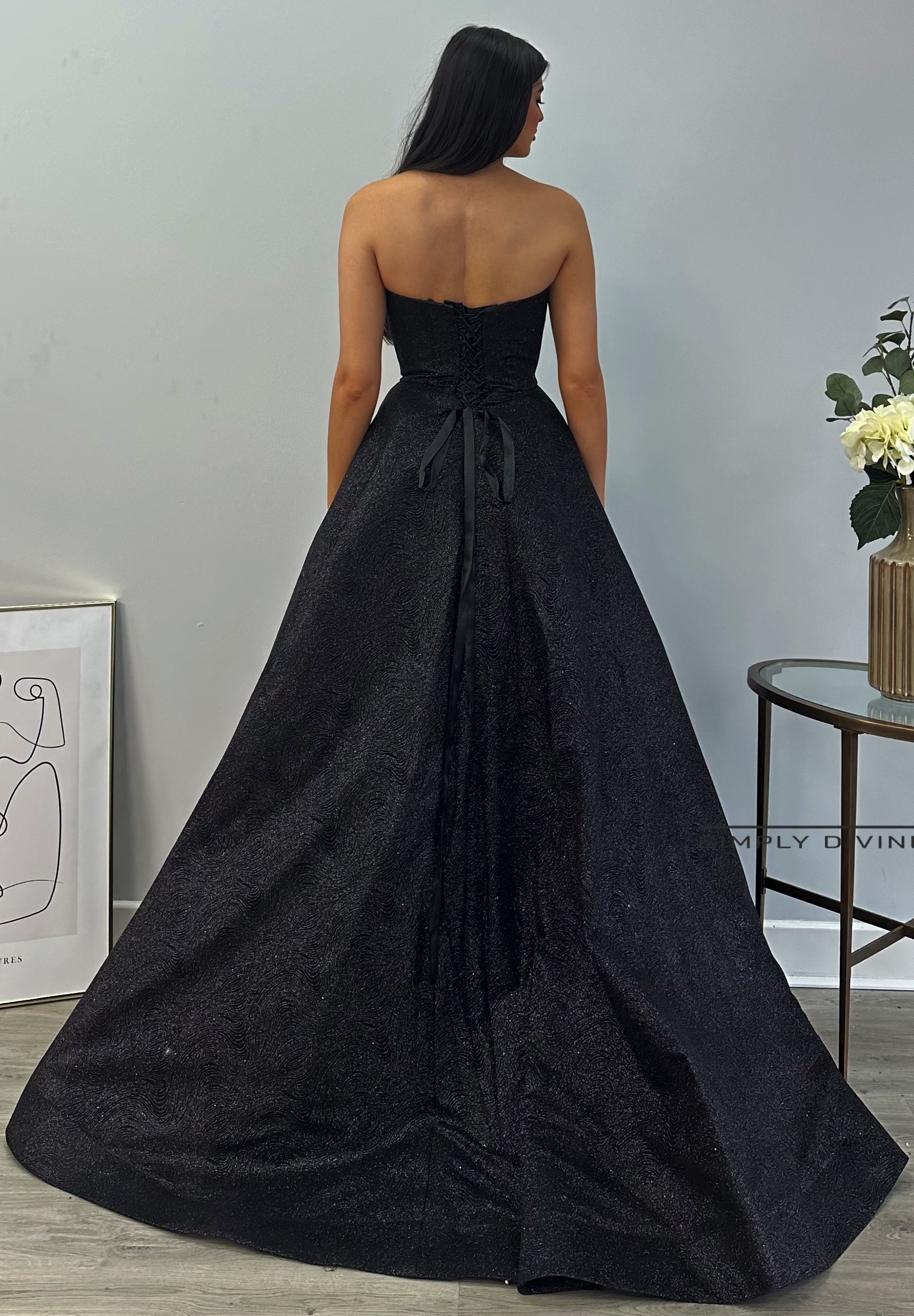 Abito brillantinato rigido Simply Divine diciottesimo con gonna larga scollo a cuore senza spalline nei colori nero e fucsia