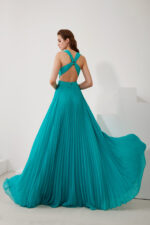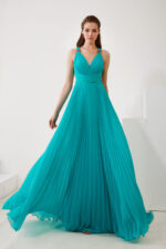 Abito celeste aquamarine maestri plissettato gonna larga con intreccio ad x sulla schiena e spalline gioiello
