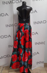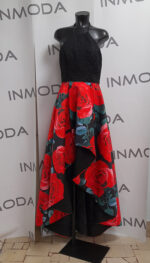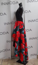 Abito corto avanti e lungo dietro nero e rosso con stampa a fiori e corpetto decorato scollo americano