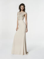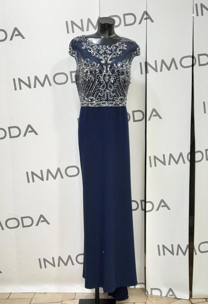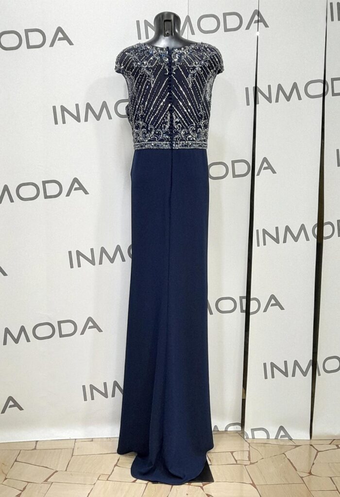Abito elegante a sirena aderente con corpetto gioiello st patrick pronovias colore blu spalle trasparenti