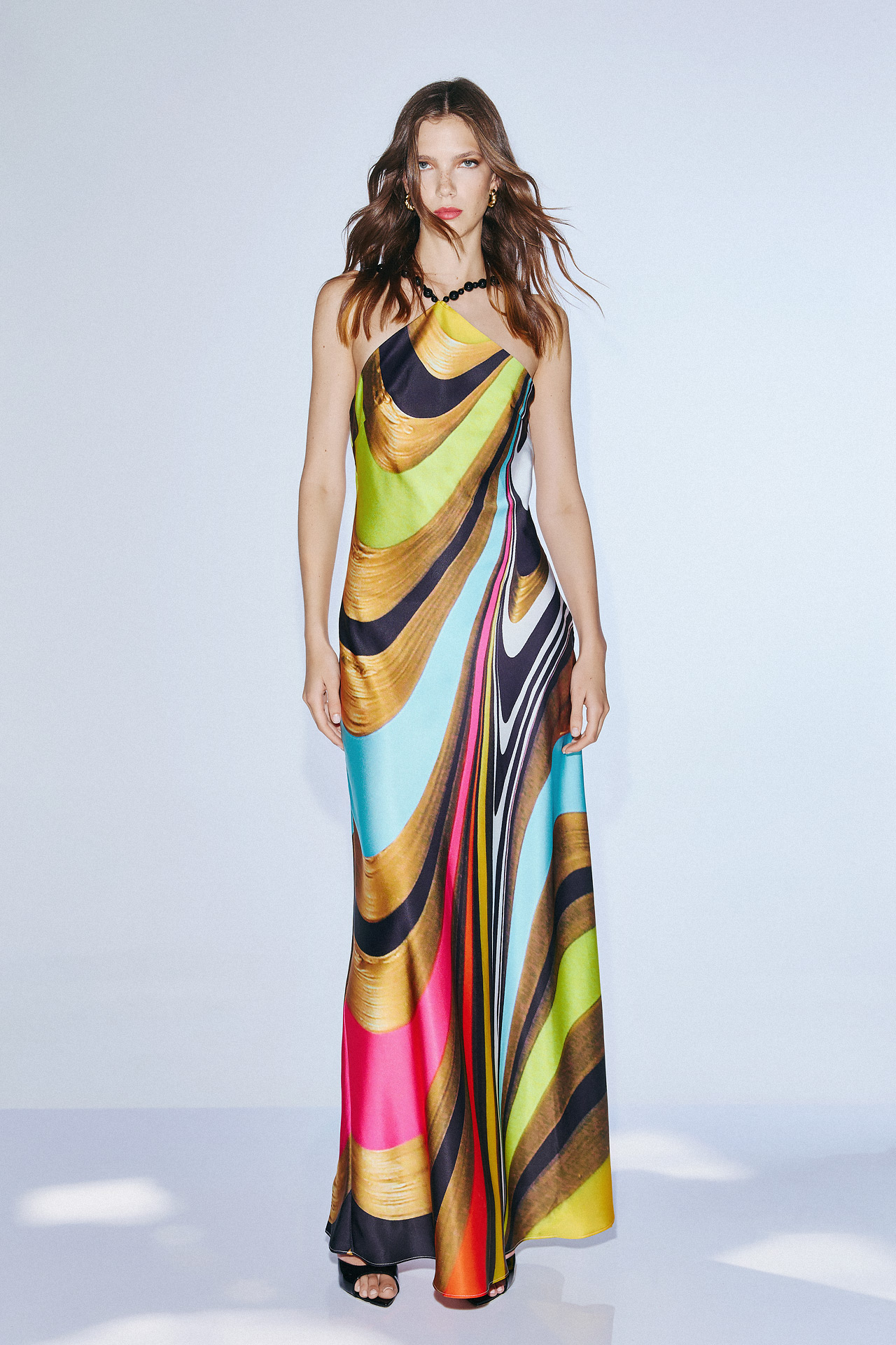 Abito fantasia Twins Fantasy morbido che scende sfiancato con collo con cristalli effetto collana nero che scendono dal centro del petto a spalline schiena scoperta