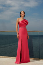 Abito fucsia aderente Maestri Haute Couture con spacco mono spalla decorato con cristalli e rouge effetto omerale