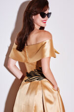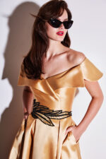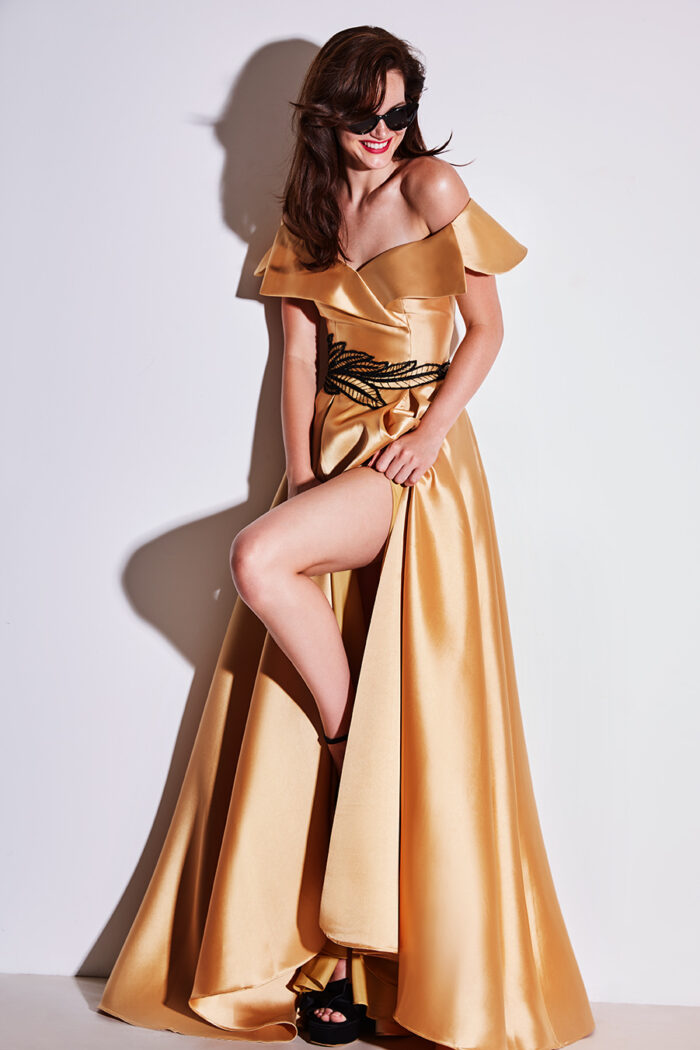 Abito gold allure evening scollo omerale lucido con decorazione foglia in nero