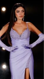 Abito lilla 18 Celebrity Impero taglio a sirena comprensivo di guanti spacco davanti seno e davanti cristalli applicati con spalline intreccio