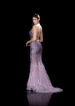 Abito lilla a sirena 18 Celebrity Impero interamente ricoperto di cristalli con taglio a sirena con fondo con piume e schiena scoperta