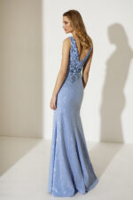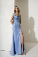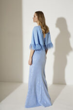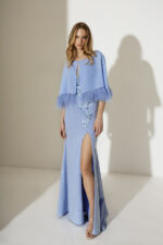 Abito lungo azzurro Allure Evening più bolero paillette sulla gonna e decoro fiori sopra bolero con piume decorative