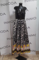 Abito lungo con gonna in rasone beige con decorazione orlo fiori colorati e corpetto paillette nero