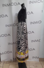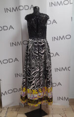 Abito maestri lungo intrecciato dietro spalle e nodo in vita fantasia viola e nero