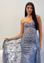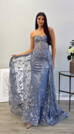 Abito lungo con pannello Simply Divine in blu chiaro con applicazioni di brillantini e paillette corpetto steccato diciottesimi