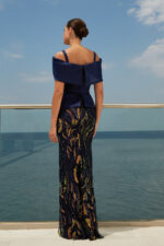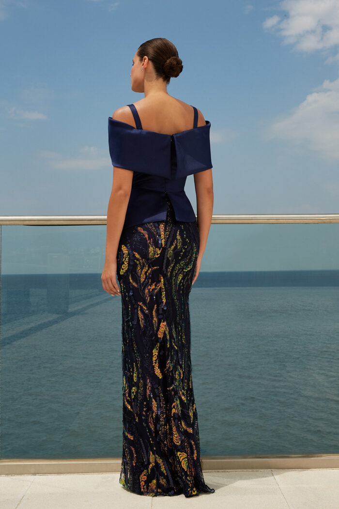 Abito lungo Maestri modello a sirena blu con paillette oro con scollo omerale e spalline sottili elegante