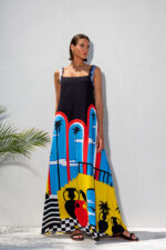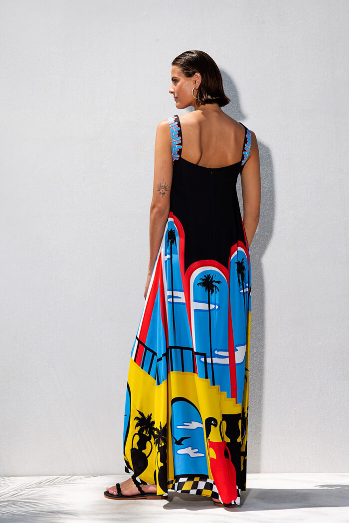 Abito lungo nero a fantasia Twins Fantasy con spalline a giro decorate e stampa sul fondo dell’abito