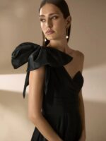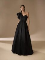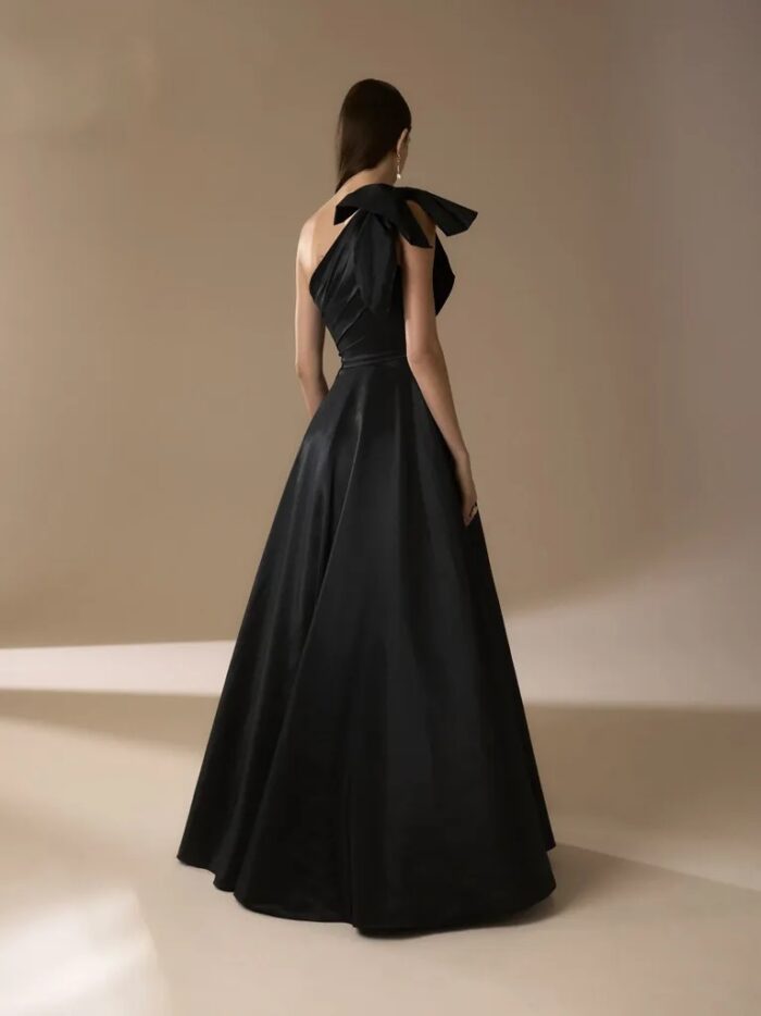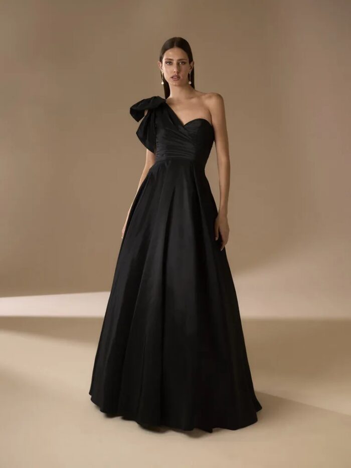Abito lungo nero Nicole Moments con gonna larga fiocco su una sola spalla tessuto rigido monospalla scollo trapezio