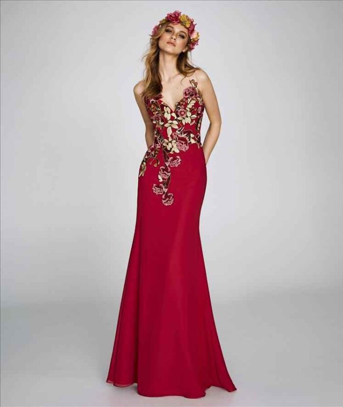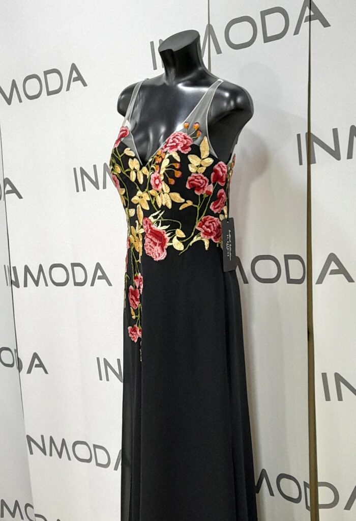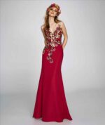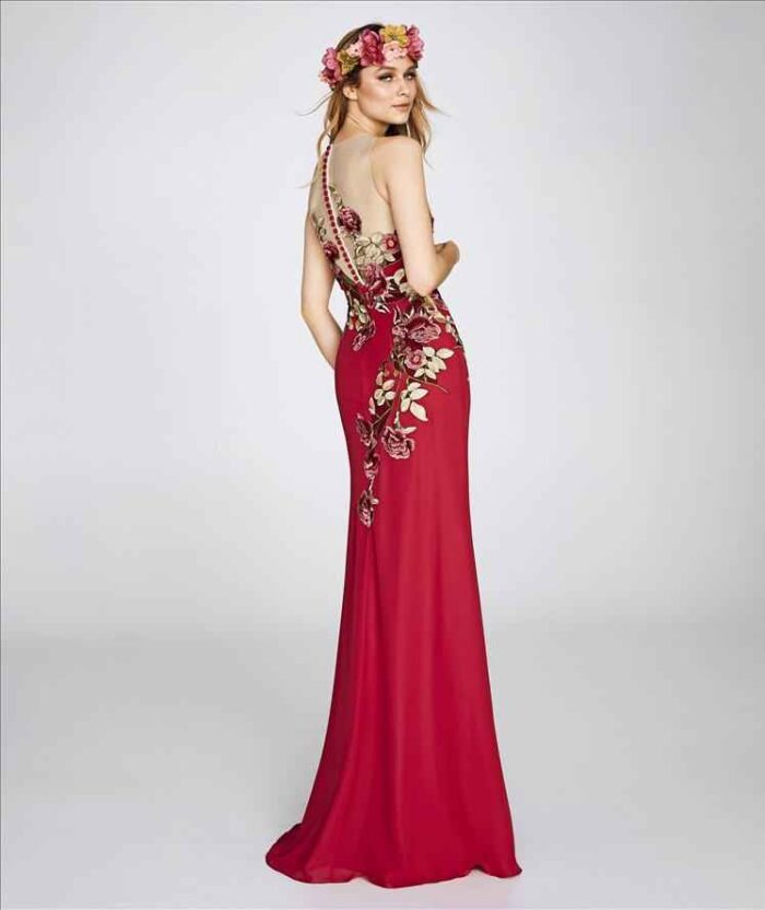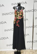 Abito lungo st patrick rosso e nero con decorazioni di fiori applicati abito a sirena