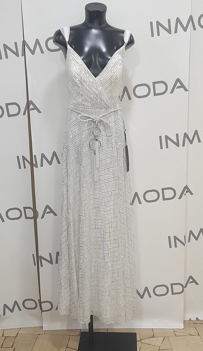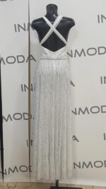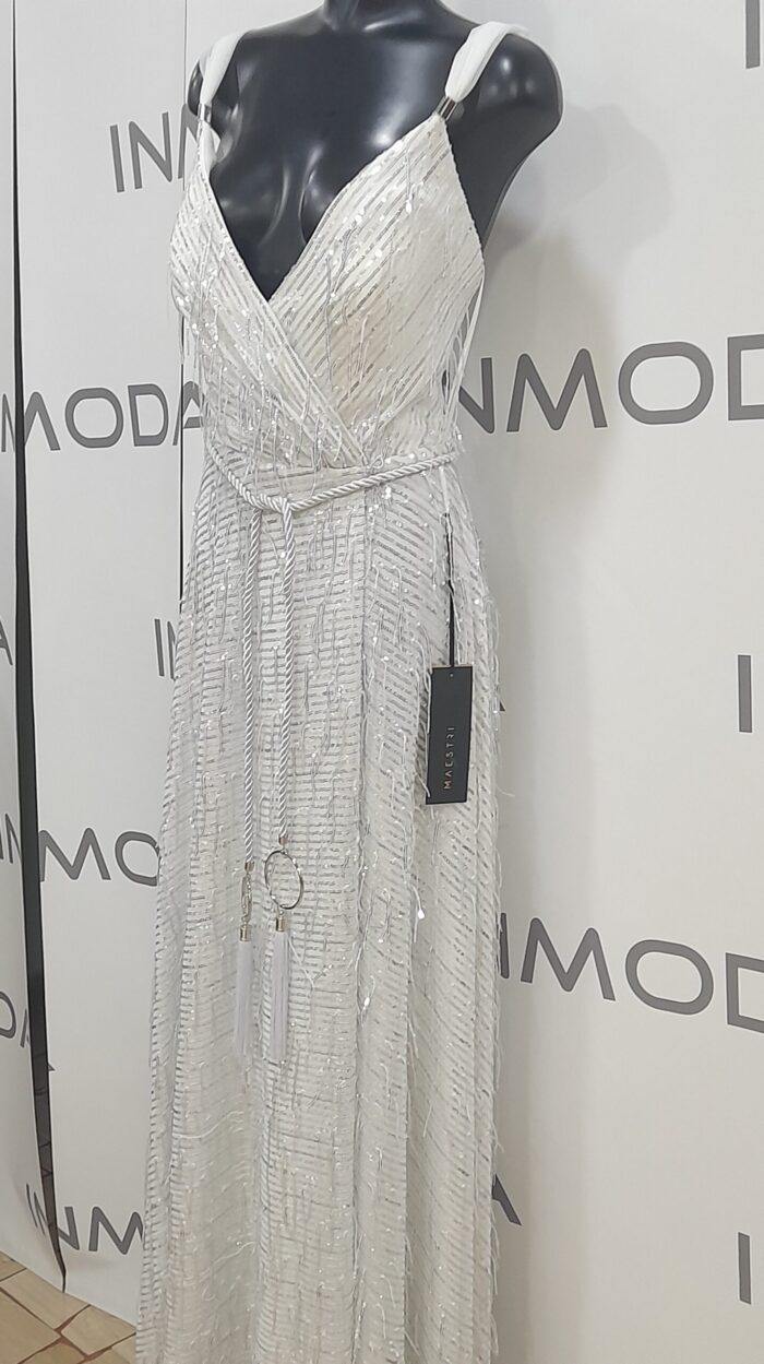 Abito maestri bianco in paillette cadenti schiena scoperta con allaccio a x e cintura in corda