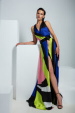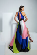 Abito maestri haute couture multicolor con spalline gioiello scollo morbido gonna larga con spacco