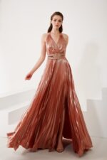 Abito lungo rosa Allure evening con cintura paillette manica corta morbida scesa