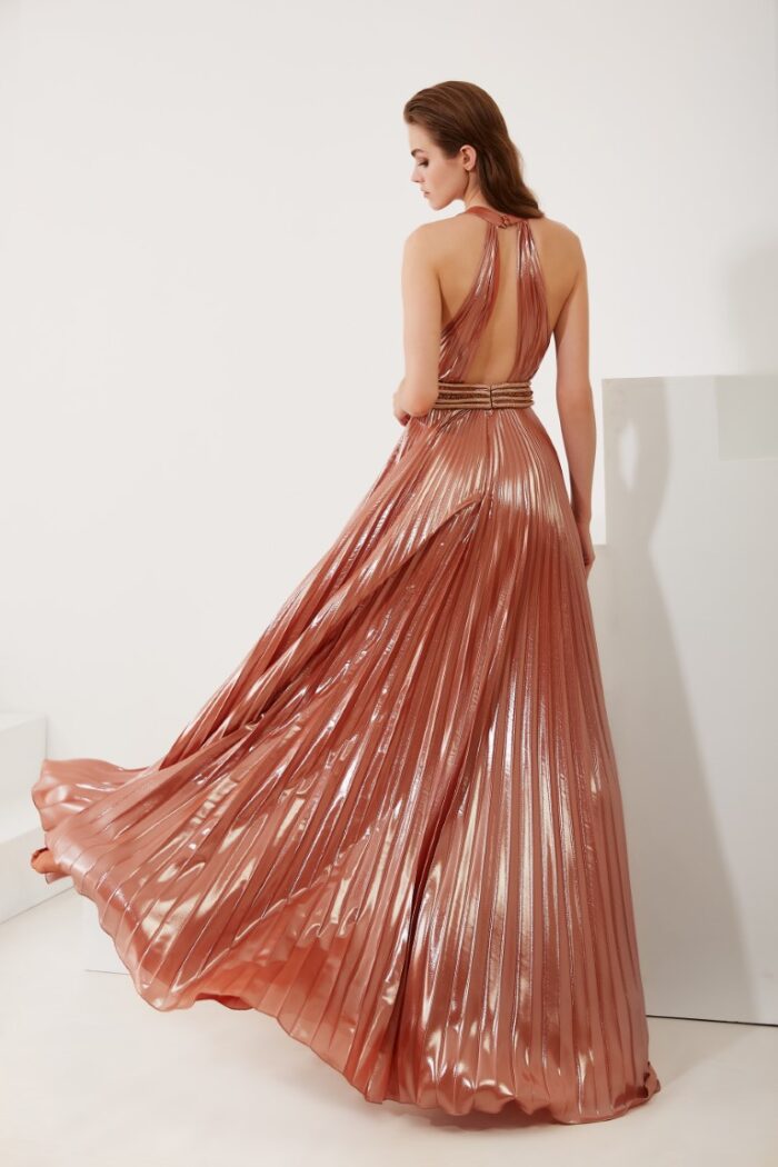 Abito maestri lungo plissettato con cintura decorata in colore rosa