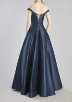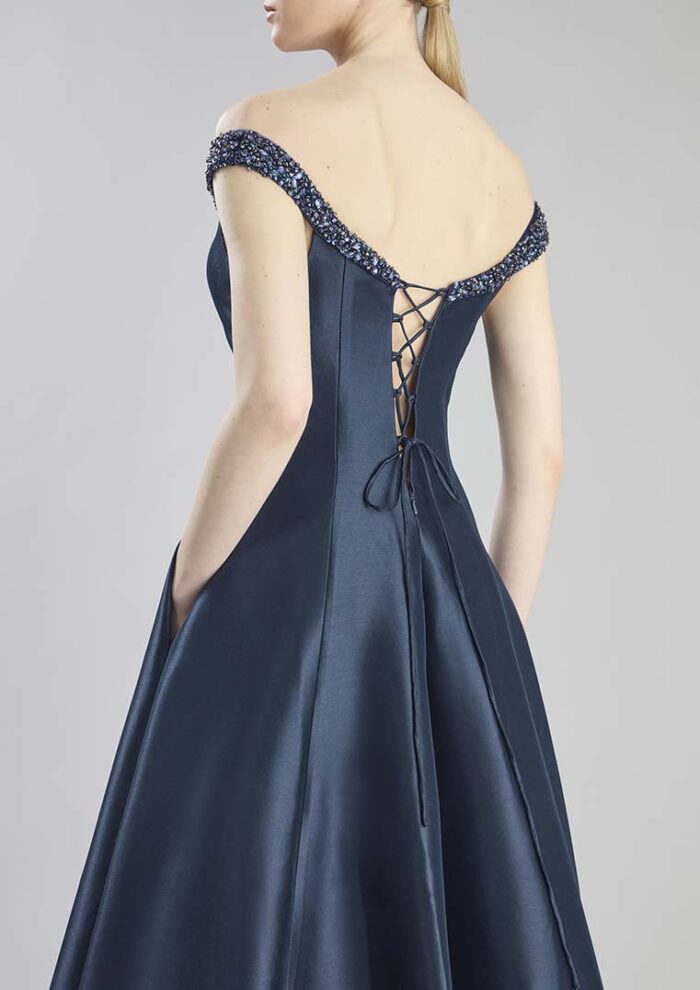 Abito mikado e cristalli Nicole Moments collo omerale gonna larga con allacciatura a stringhe blu e rosso