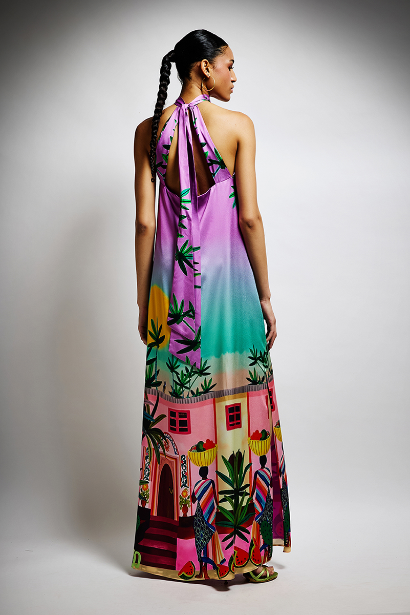 Abito morbido Twins Fantasy in fantasia sul viola con stampa scollo americano con nodo dietro spalle scoperte e colletto avanti