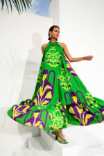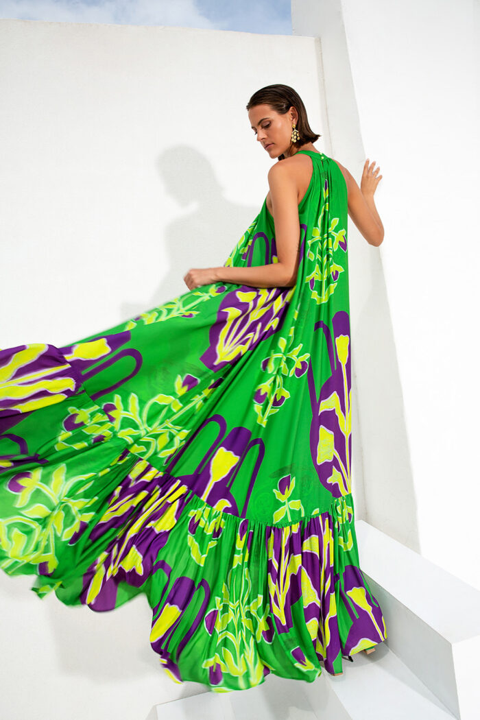 Abito morbido verde e viola Twins Fantasy con balza nella parte sotto e scollo americana