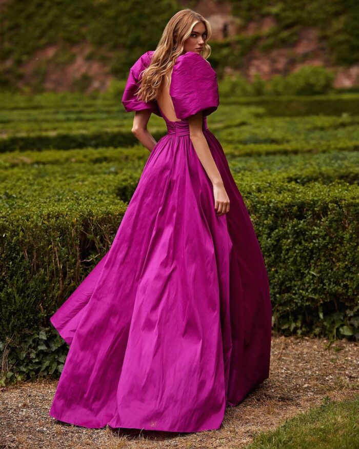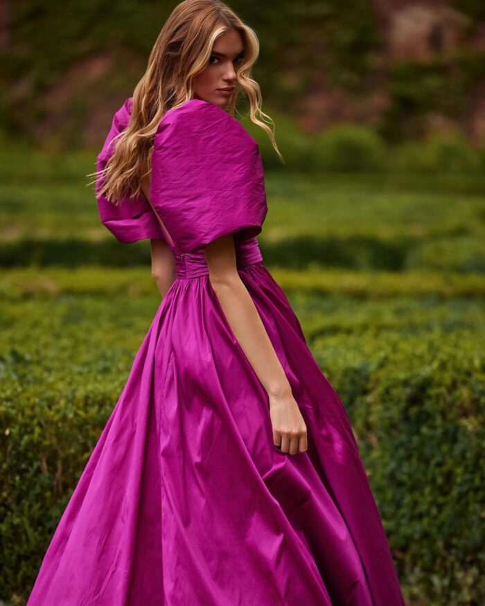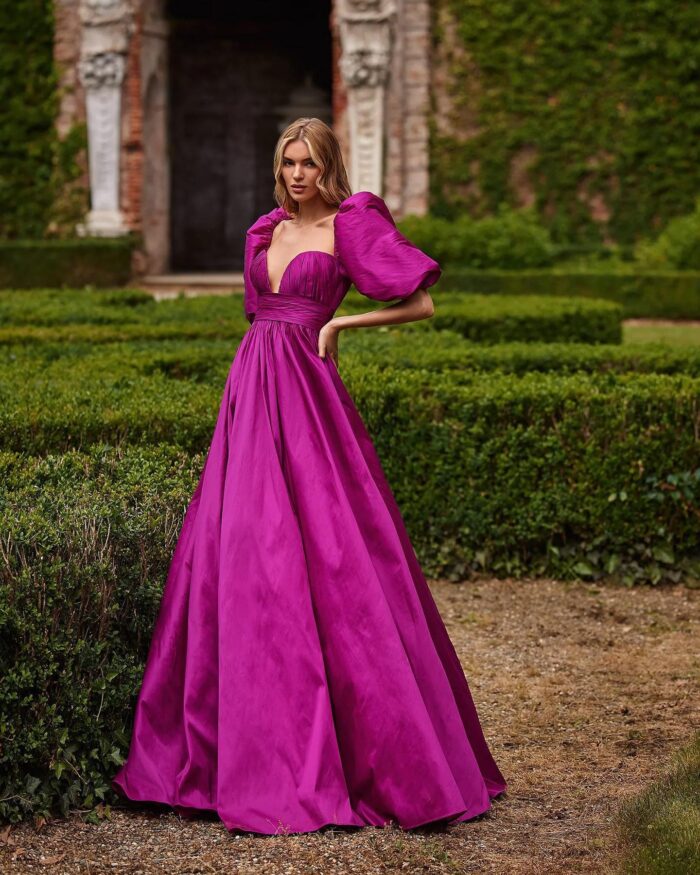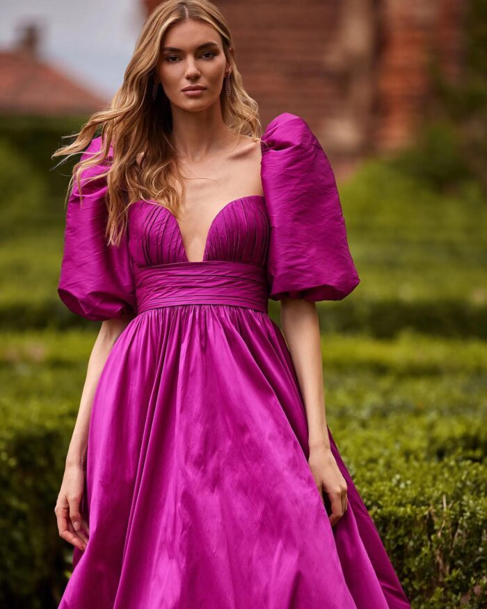 Abito nicole moments fucsia lungo con gonnellone scollo a cuore molto accentuato e spalline a palloncino