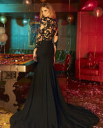 Abito pronovias nero gonna morbida con coda sopra pizzo con manica lunga effetto tatoo