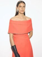 Abito Pronovias The Party Edit color corallo abito lungo morbido con mantellina integrata decorata con coralli scollo omerale