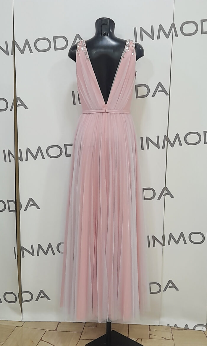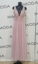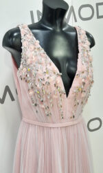 Abito rosa lungo con cristalli e petali d’argento a decorare il top e gonna ampia con tulle sopra
