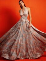 Abito lungo bluette Elisabetta Franchi for Pronovias con spalline decorate in cristalli aderente con mantello che scende sino ai piedi e a coda
