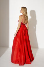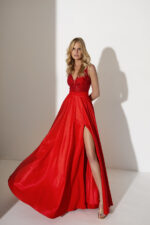 Abito rosso allure evening lucido con gonnellone in raso parte superiore scollo a cuore pizzo decorato brillantini